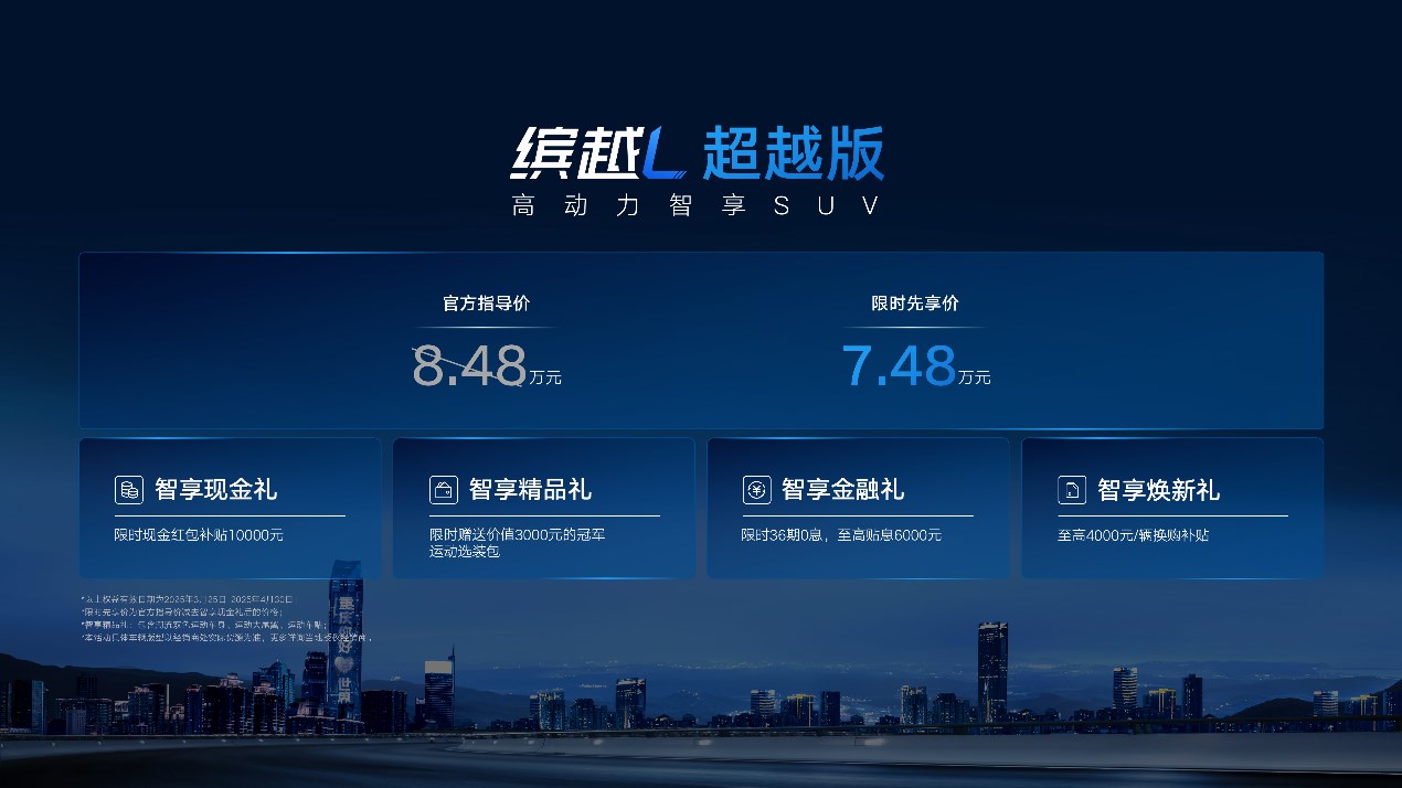 3月25日,“越BATTLE 越好玩” 吉利缤越L城市挑战赛暨超越版上市发布在“8D魔都”重庆开启,“高动力智享SUV”吉利缤越L超越版加新上市,官方指导价8.48万元,现金补贴后限时先享价7.48万元。新车共推出4项限时先享权益,4月30日前购车的用户均可享受: