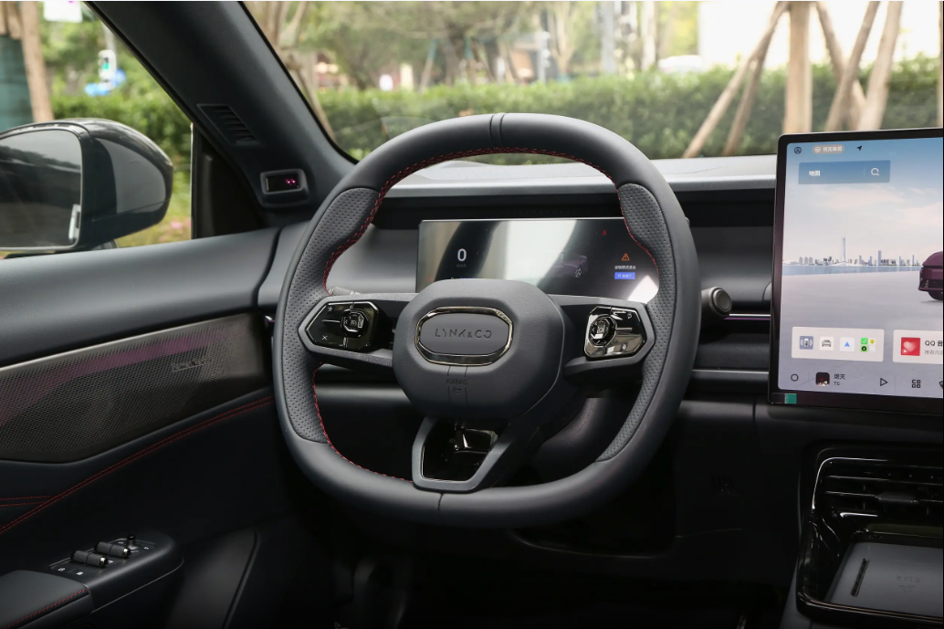 内饰方面,领克 07 EM-P的车内造型简约时尚,具有不错的横向延展性,也符合大多数人的审美需求。较为扁平的方向盘握感充实,运动化风格显著,不过手感稍微偏硬一些。领克 07 EM-P全系标配高通骁龙 8295 芯片,这款芯片采用5nm制程,AI算力达30TOPS,日常使用时,不管是同时打开导航、音乐、视频,还是切换不同应用,车机都不会出现卡顿,操作流畅度和手机差不多。搭配的 LYNK Flyme Auto2车机系统也很贴心,支持壁纸、车辆Alive、地图三种形态的桌面,还能根据不同场景(比如高速领航、泊车辅助)自动切换 SR 感知现实界面,把车外的交通参与者、道路设施实时 3D 渲染在屏幕上,信息很直观。