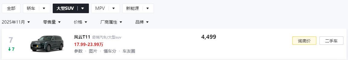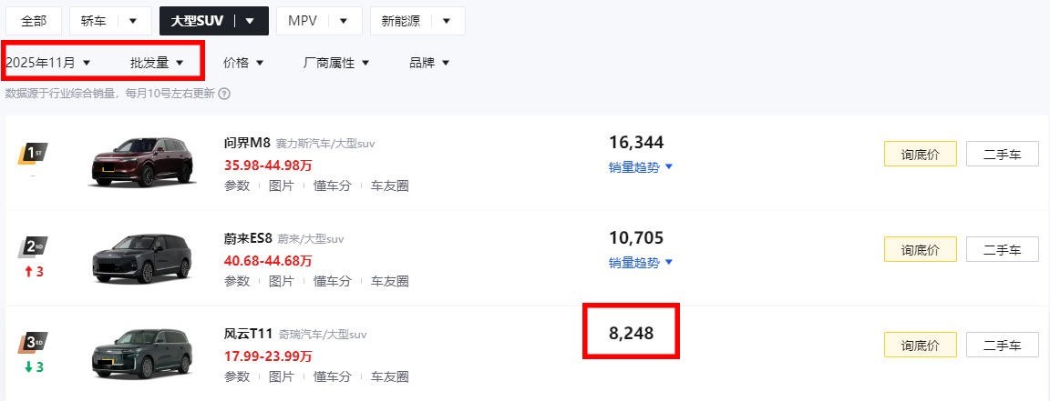 说实话,倘若仅看批发量,那风云T11其实已经成为了大型SUV销量前三,排在它前面的,是问界M8的16344辆和蔚来ES8的10705辆。要知道,前面这两款车可都是“大热选手”,无论是产品本身的硬实力,还是营销宣传上所花费的功夫,那都比风云T11要多得多。所以,风云T11能在上市的首个完整月份便挤进批发销量前三,我觉得其实已经能算是成功了。