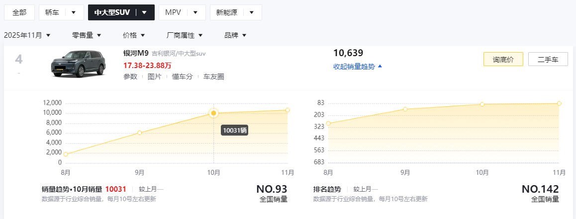最后,我也想问问大家:风云T11既然卖着和吉利银河M9差不多的价格,尺寸又还比银河M9更大,定位是大型SUV,那它能否在后期取得跟银河M9一样的月销破万辆水平呢?要知道,吉利银河M9可是已经连续在10月、11月都取得了零售销量破万辆的好成绩,所以,奇瑞风云T11是否也能复制银河M9的销量成绩?让我们拭目以待。(文/优视汽车 大卓 )