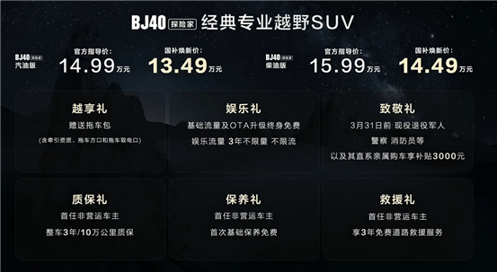 作为BJ40系列的焕新力作,BJ40探险家在价格方面是相当有诚意,官方指导价14.99—15.99万元,别急,北京越野给咱又让了1.5万!汽油版价格来到了13.49万,柴油版则是14.49万。同时,还附送了价值1.2万的购车福利打包礼:比如说,给咱们越野人配齐拖车包(含牵引资质、方口和取电口),还能享终身基础流量+OTA免费升级、3年娱乐流量不限量;现役退役军人、警察、消防员及直系亲属3月底前购车还能再拿3000元补贴。售后方面更是不用愁,首任非营运车主能享3年/10万公里整车质保、首次基础保养免费,再加3年免费道路救援,硬核越野+实惠福利,这波入手真不亏!