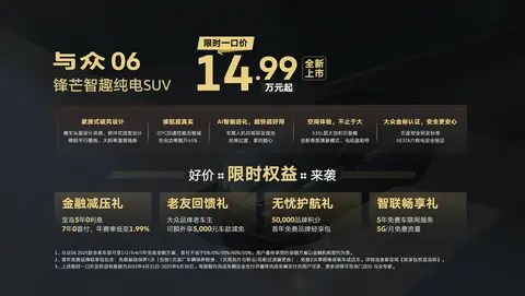在产品序列进一步丰富的同时,金标大众还推出了高质价比的购车方案。与众06限时一口价14.99万元-20.99万元,并为车主提供5年0息和行业第一的7年0首付金融方案。此外提供高额置换补贴、品牌轻享包、超长质保、5年车联网服务等限时权益,并赠送50,000积分,可兑换游戏手柄、品牌充电墙盒、充电卡等,也可用来抵扣改色车衣价格。除上述权益外,上海车展/五一假期期间购车还有特别权益,金标大众额外提供4,000元(Pure)/ 6,000元(Pro/Ultra/Max)车辆折扣,全面降低购车门槛。