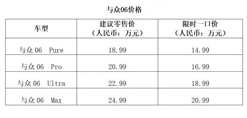 Pure与Pro、Ultra、Max共同组成了与众06的多元化版本选择,可以满足不同用户的多场景用车需求。用户可根据自身预算与使用习惯灵活选择,在确保核心体验的同时,兼享合理配置与优质价值。