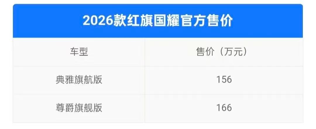 红旗国耀在近期上市了新的2026款车型,新车售价区间为156-166万元,价格可以说是相当感人。那么,对于有钱人们来说,156万起的新款红旗国耀是否值得购买呢相比起大火的仰望U8,其又有哪些不一样的产品优势?我们一起来看看。