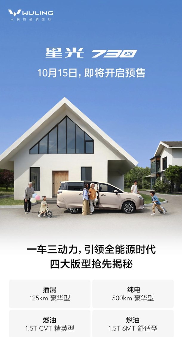 10月13日,买车网Buycar获悉,五菱银标宣布五菱星光730将于10月15日开启预售,将推出插混 125km 豪华型、纯电 500km 豪华型、燃油 1.5T 6MT 舒适型、燃油 1.5T CVT 精英型共计四款车型。该车已于9月23日开启预订,1000元订金可享2000元车款抵扣权益。