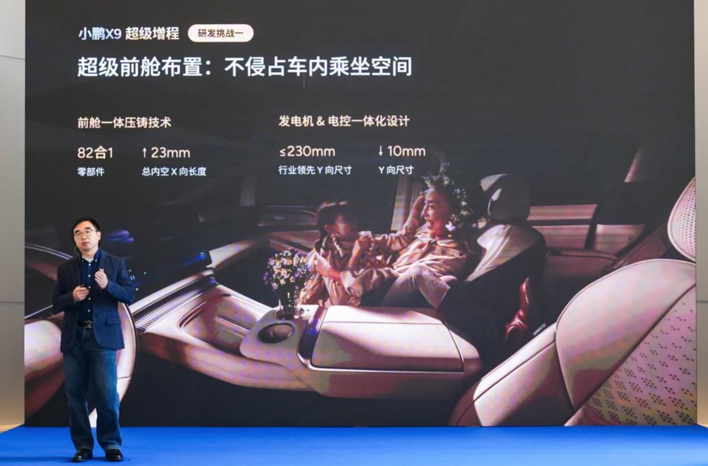 亮眼数据的炼成,更离不开对空间、效率的极致打磨。面对前舱布局紧凑的难题,小鹏X9超级增程在不压缩座舱乘坐空间的前提下,小鹏汽车与华为选择通过发电机与电控的高集成度设计,将发电机Y向尺寸极致压缩至≤230mm。结合小鹏汽车的前舱一体压铸技术,实现零部件82合⼀,总内空X向⻓度提升23mm,共同实现了前舱空间利用率的行业突破。