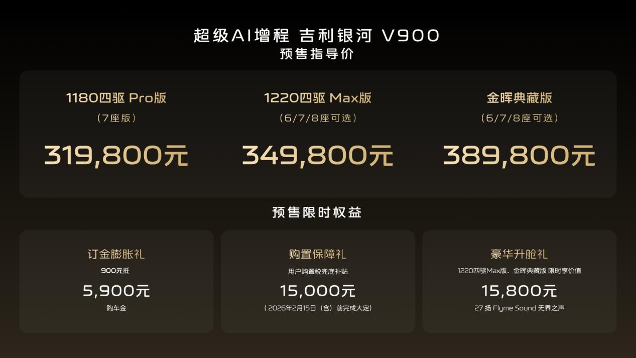 1月7日,吉利银河旗下V系列的首发之作,“AI全场景家庭旗舰MPV”——吉利银河V900正式开启预售,共计3个版本,预售指导价格区间为31.98万元~38.98万元。新车围绕中国大家庭出行的真实需求,以宽奢空间、豪华驾控、全维安全、AI智能几大全能满配实力,重新定义豪华旗舰MPV价值标准,树立AI全场景豪华出行新高度。