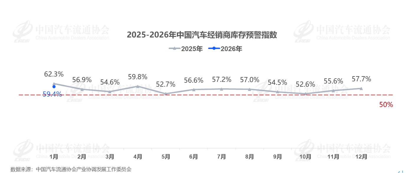 库存高企、需求平淡、政策调整效应待释放……2026 年 1 月中国汽车市场在多重因素交织下开局承压。根据中国汽车流通协会发布的数据显示,2026年1月中国汽车经销商库存预警指数为59.4%,同比下降2.9%,环比上升1.7%。