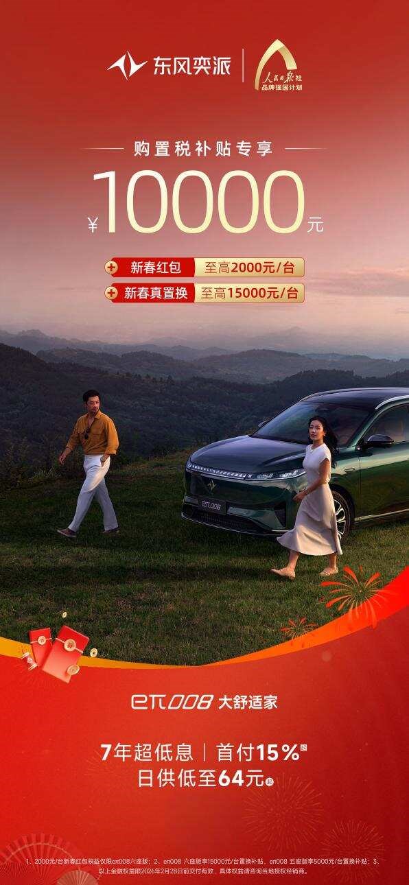 备受家庭用户青睐的“大舒适家”奕派008,以“真满配、真智能、真超值”全能产品力满足用户多元化需求。值新春之际,推出限时10000元专享购置税补贴、至高15000元置换补贴等福利;此外,即日起至2月28日前,凡在东风奕派官方APP/小程序下订奕派008的用户,还可领取2000元“马利”红包,为新的一年增添“马上有利”好彩头!在金融端,还推出7年超低息、首付15%起、日供仅64元起购车政策,让更多家庭轻松升级出行品质。作为家庭SUV的价值标杆,奕派008以更高品质、更具温度的体验,重新定义家庭出行新高度。