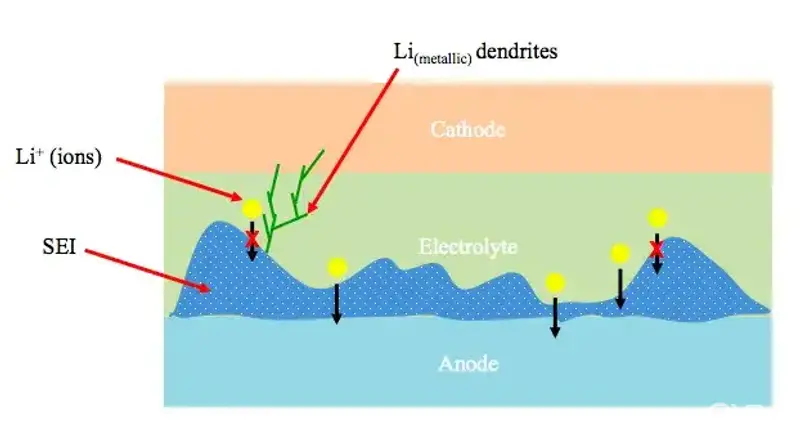 更危险的是,当SEI膜破裂未再生的间隙,锂离子不能及时通过SEI膜嵌入内部的石墨层,就会滞留在负极表面,还会得到电子,在电解液中还原成金属锂。