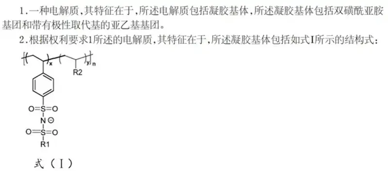 专利 CN121307179A 披露了一种神奇的凝胶电解质,它的核心是同时含有双磺酰亚胺基团和带有极性取代基的亚乙基基团。