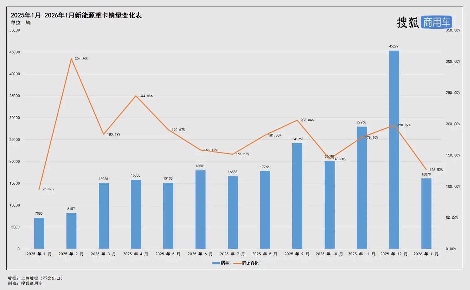 政策红利驱动下,新能源重卡年末“翘尾效应”明显。终端上牌数据显示,2025年12月,我国新能源重卡销量为45299辆(不含出口),同比增长198.02%,历史上首次突破4万辆,创下月度销量最高纪录。“翘尾”之后,进入2026年新能源重卡涨势不减,开年首月终端销量为16070辆(不含出口),同比增长126.82%,继续保持增长势头。