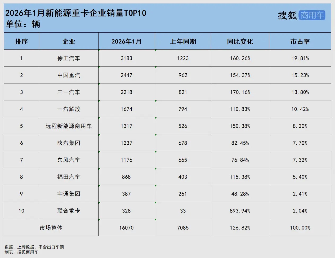 排名第十的联合重卡,在奇瑞集团的赋能下,市场表现抢眼,1月销售新能源重卡328辆,同比暴涨893.94%,市占率2.04%,这一增幅不仅领跑行业前十企业,也延续了之前的跨越式增长态势。面向2026年1.2万辆销量目标,联合重卡已经升级电麒麟系列产品、推出 800V电凤凰等新品,产品矩阵更加完善,有望成为新能源重卡市场的新晋潜力选手。