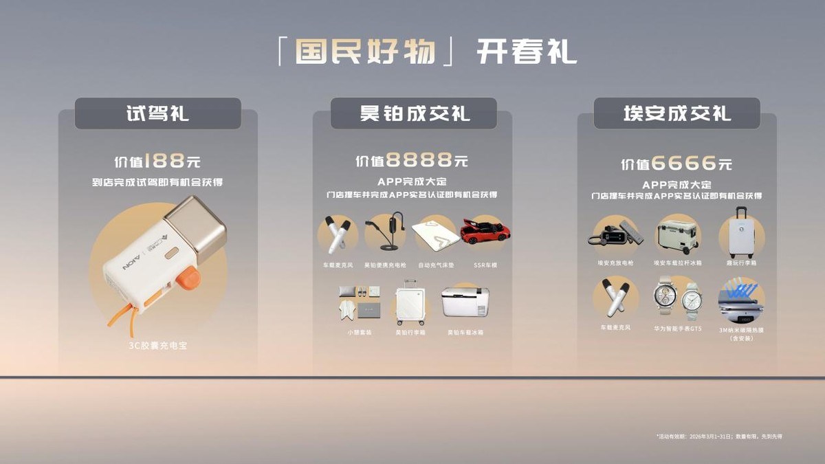 为庆祝马年新春以及三大国民系列IP正式发布,3月份,在昊铂或埃安销售门店完成试乘试驾,即有机会获得价值188元的国民好物试驾礼;完成下定,即有机会获得价值8888元或6666元的国民好物成交大礼包!