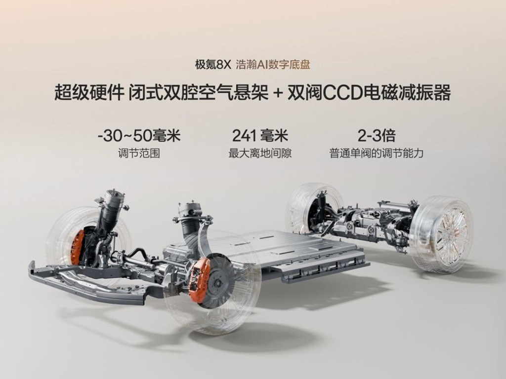 极氪8X搭载了浩瀚AI数字底盘,配备了闭式双腔空气悬架+双阀CCD电磁减振器、48伏主动稳定杆等硬核配置 。这套组合拳保证了车辆在激烈驾驶时的支撑性,也能在颠簸路面带来顶级的滤震表现。其83.6km/h的麋鹿测试成绩,对于一台车长5.1米、车宽近2米的中大型SUV来说,堪称离谱。