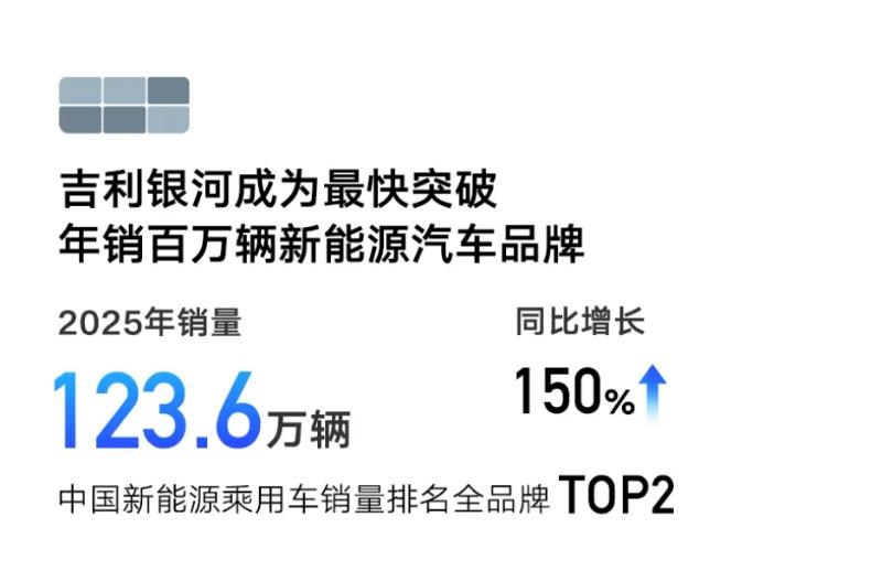 这里面,吉利银河表现尤为出色。数据显示,2025年吉利银河全年销售近124万辆,同比增长150%,占新能源总销量超73%,成为拉动增长的绝对主力。吉利银河精精准卡位在10万-20万元主流家用市场,凭借“电混+纯电”双线布局、高性价比与智能化配置,快速抢占市场份额,验证了吉利在主流新能源赛道的产品力与定价能力。