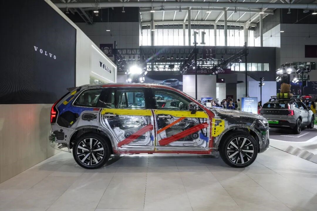 在展会上,沃尔沃展出了一台XC90透明版安全展示车,通过分色涂装的白车身,将内部的安全结构和用料“透明化”地呈现给观众。车身以不同颜色标示材料:绿色部分为铝合金,暖色系为高强度钢,其中红色的硼钢强度高达1500兆帕,并通过“6横6纵”笼式车身结构保障乘员生存空间。该车在车头、车尾及B柱下端等关键位置设有溃缩吸能区,用以吸收和缓解碰撞冲击。制造工艺上,全车约6000个焊点全部经过100%检测,且沃尔沃每6周会抽取一台白车身进行“撕毁”检测,从源头确保焊点质量与车身结构的绝对稳固。