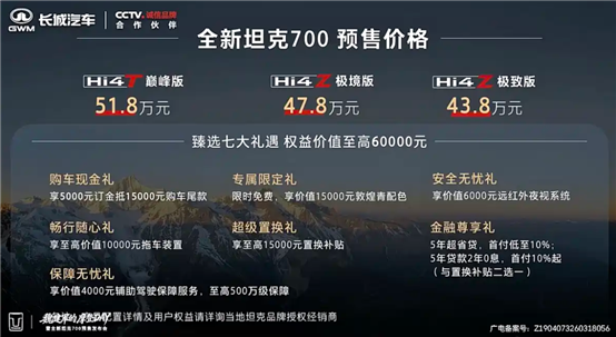 3月30日,坦克品牌正式官宣新款坦克700 Hi4-T与Hi4-Z系列车型同步开启全国预售。作为品牌旗下定位高端的新能源硬派越野旗舰,新车以双动力、双定位的差异化产品矩阵入市,其中Hi4-Z系列推出两款车型,预售价分别为43.8万元、47.8万元,主打泛越野全场景适配;Hi4-T系列推出一款车型,预售价51.8万元,聚焦硬核越野性能,精准覆盖了不同用户的用车需求。