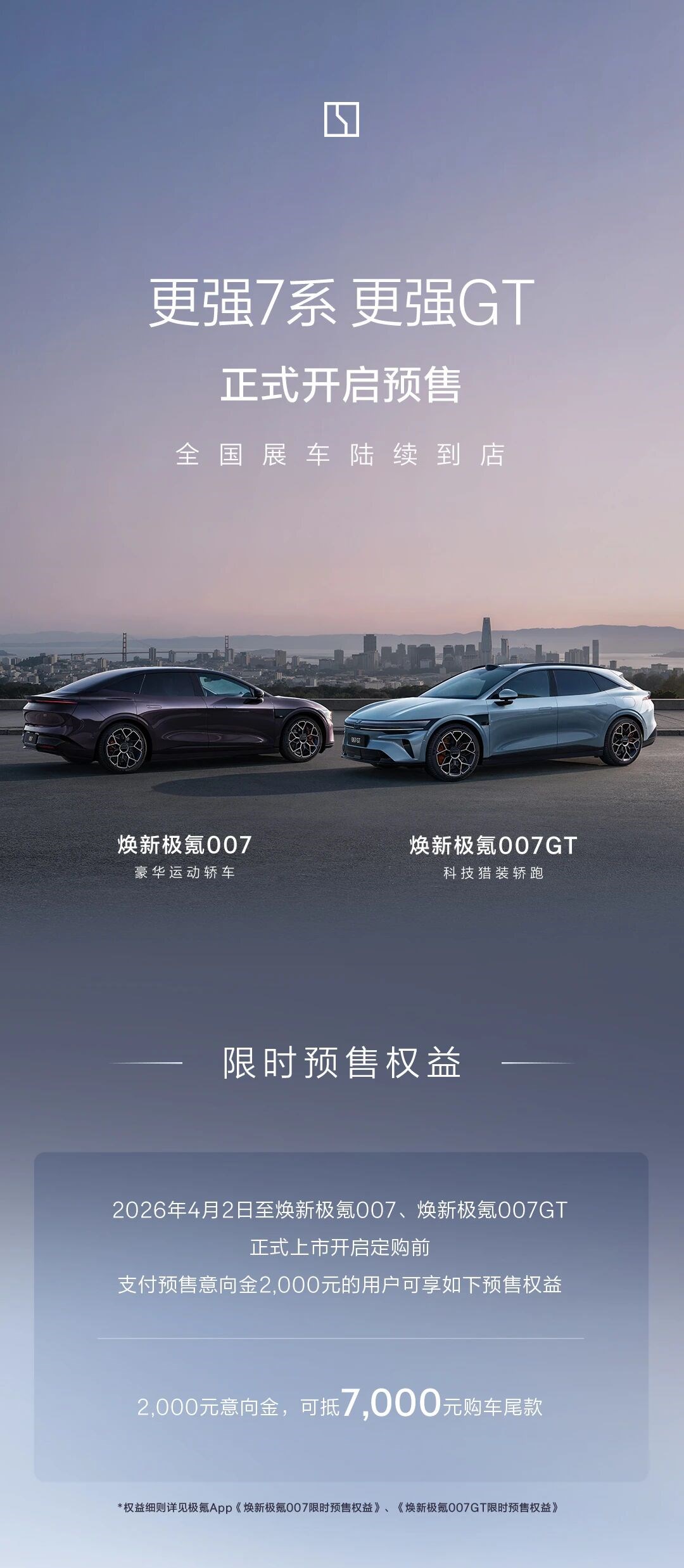4月2日,买车网Buycar获悉,焕新极氪007和焕新极氪007GT正式开启预售,即刻预订,享2000元抵7000元限时预售权益。两款车型在性能、智能、安全等方面进行了全面升级,并将于4月10日正式上市。