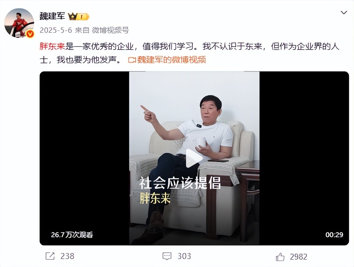 早在2025年,于东来因为玉石产品的事遭遇网暴,全网都等着看笑话的时候,当时跟于东来素不相识的魏建军,第一个站出来公开发声,实打实地力挺他。而魏建军也早就偷偷“粉”了胖东来很多年,他自己说,之前为了学习胖东来的经营理念,专门跑到许昌,结果店里人太多,他拍了条视频就悄悄走了,没好意思打扰。