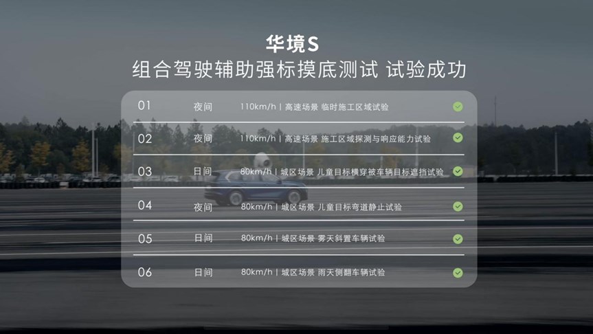 从已公布的测试成绩来看:夜间高速120km/h前车切出后遇静止车,成功刹停;70km/h夜间儿童“鬼探头”,成功避险;110km/h夜间连续避让掉落障碍物。六个“地狱级”工况全部通过,且已经提前满足了行业首个L2强标的65项摸底测试。