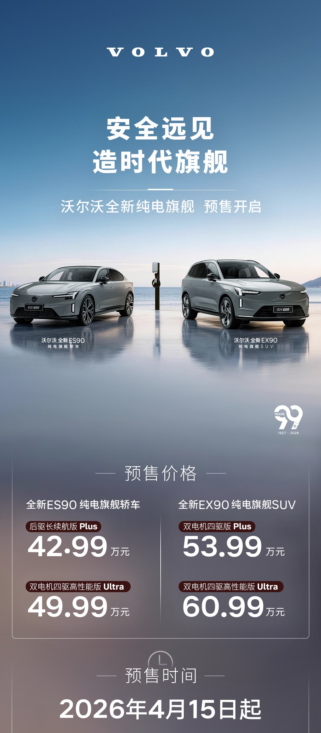 4月15日,买车网Buycar获悉,在沃尔沃品牌99周年暨新品发布会上,沃尔沃全新EX90、ES90正式发布并开启预售,其中EX90共推出2款车型,预售价53.99-60.99万元,全新ES90共推出2款车型,预售价42.99-49.99万元。两款新车基于SPA2纯电架构打造,延续了沃尔沃安全基因与北欧设计美学。