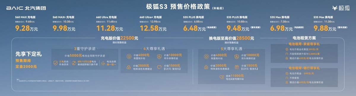 发布会上,极狐汽车为广大用户量身定制了总价值22500元的限时预售权益,包括享受购置税补贴4000元,免费送价值5000元电池全周期守护承诺、价值2000元的特殊漆色以及价值1500元的S次元·智选礼以及价值10000元的用车保障权益。现在即刻下订,就能第一时间锁定全部超值福利,不用等待,直接告别充电排队、续航焦虑,开启省钱又省心的高品质家用纯电出行。