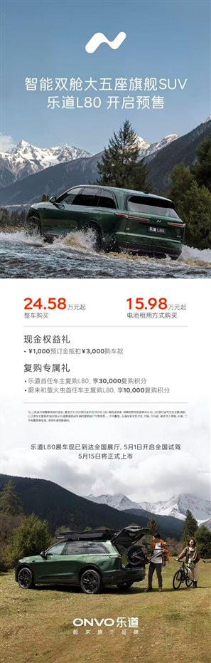 4月28日,蔚来汽车旗下品牌乐道汽车在杭州举办乐道L80产品技术发布会。会上,蔚来创始人、CEO李斌正式公布了乐道L80的预售价格:整车购买24.58万元起,BaaS电池租用方式购买15.98万元起。这款备受关注的大五座SUV将于5月15日正式上市,目前展车已在全国展厅到位,5月1日起开启全面试驾体验。