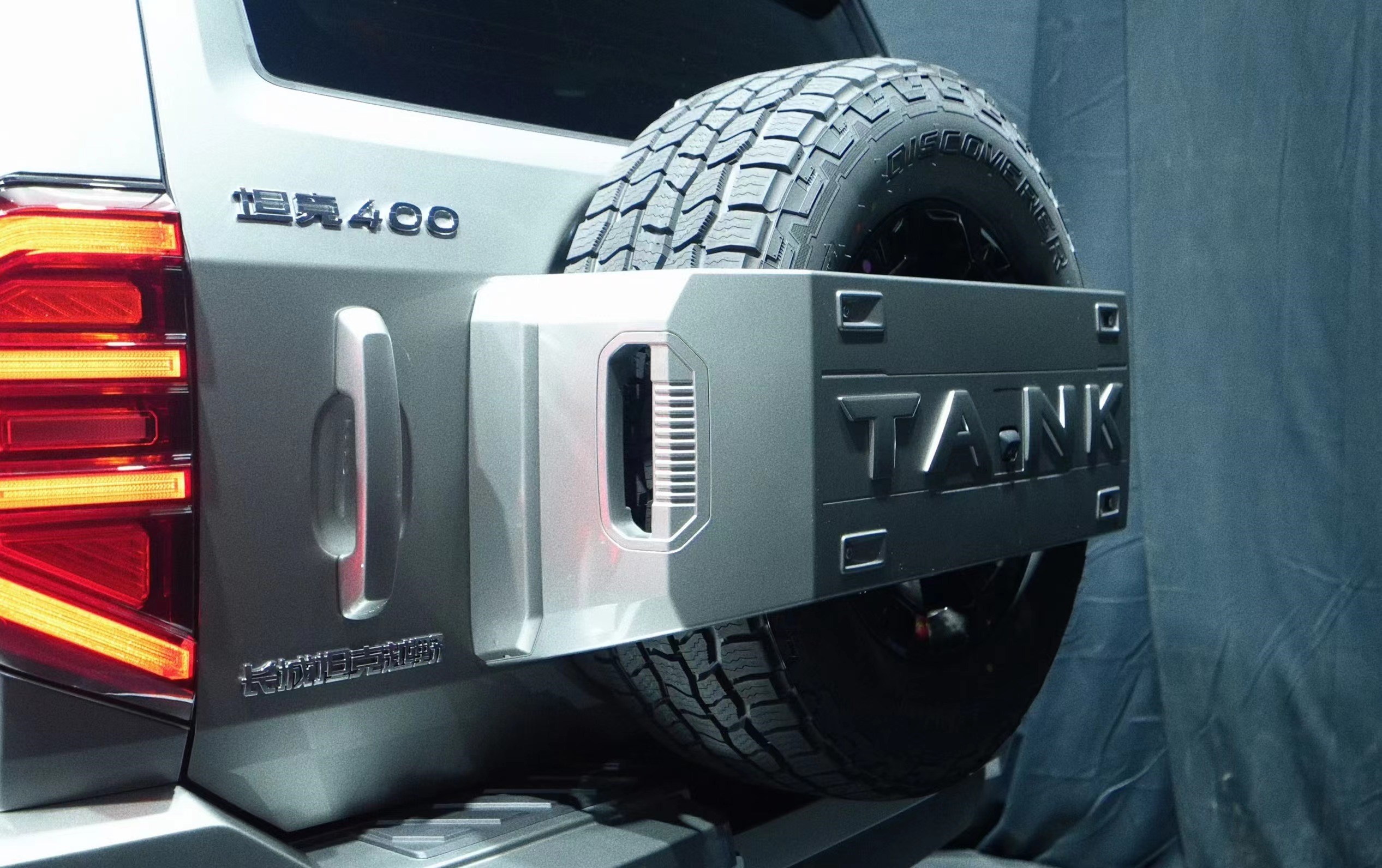 车身侧面看起来要更加硬朗一些,突出的轮眉延伸感很强,还有着类似钉子的设计,上方则是银色的行李架。尾部设计依旧呈现硬朗的感觉,细节设计充满力量感,顶部设有一处鸭翼,搭配外挂式的备胎,力量感十足。