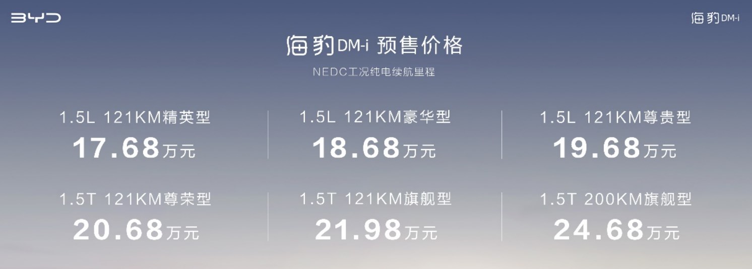 动力方面,海豹DM-i采用DM-i超级混动技术,搭载骁云-插混专用1.5L高效发动机/骁云-插混专用涡轮增压1.5Ti高效发动机两款动力单元,提供NEDC工况下121公里和200公里两种纯电续航里程,满油满电综合续航可超1300公里。