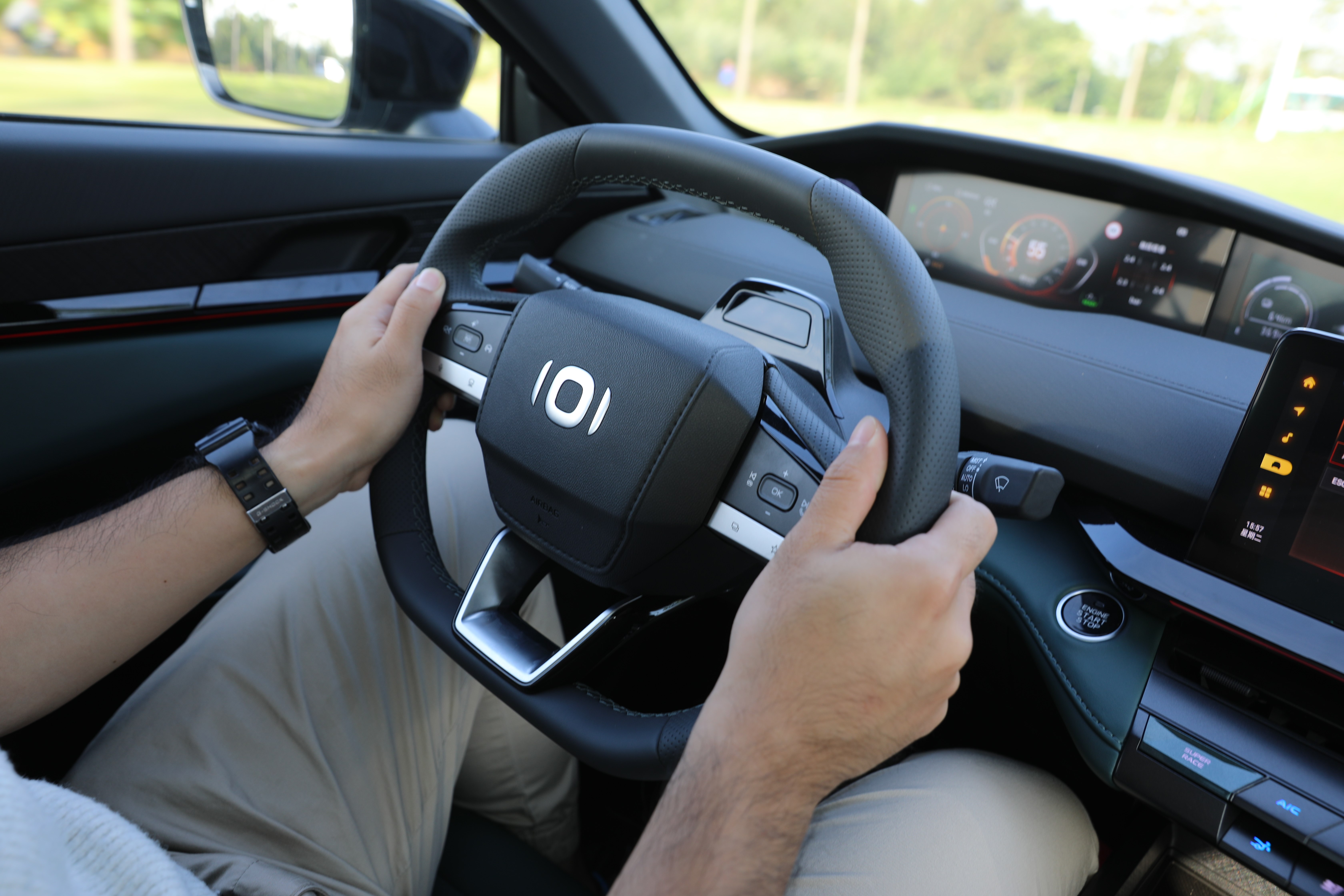 智能驱动模式能够帮助车辆在不同电量状态下,以最优的驱动结构对动力进行分配,而当笔者启动SUPER RACE模式,首先映入眼帘的是仪表盘、中控屏切换到更激进的界面UI,其次,车辆的动力进入到严阵以待的状态,油门响应更为积极,配合模拟声浪,整车的运动气质完全展现出来。