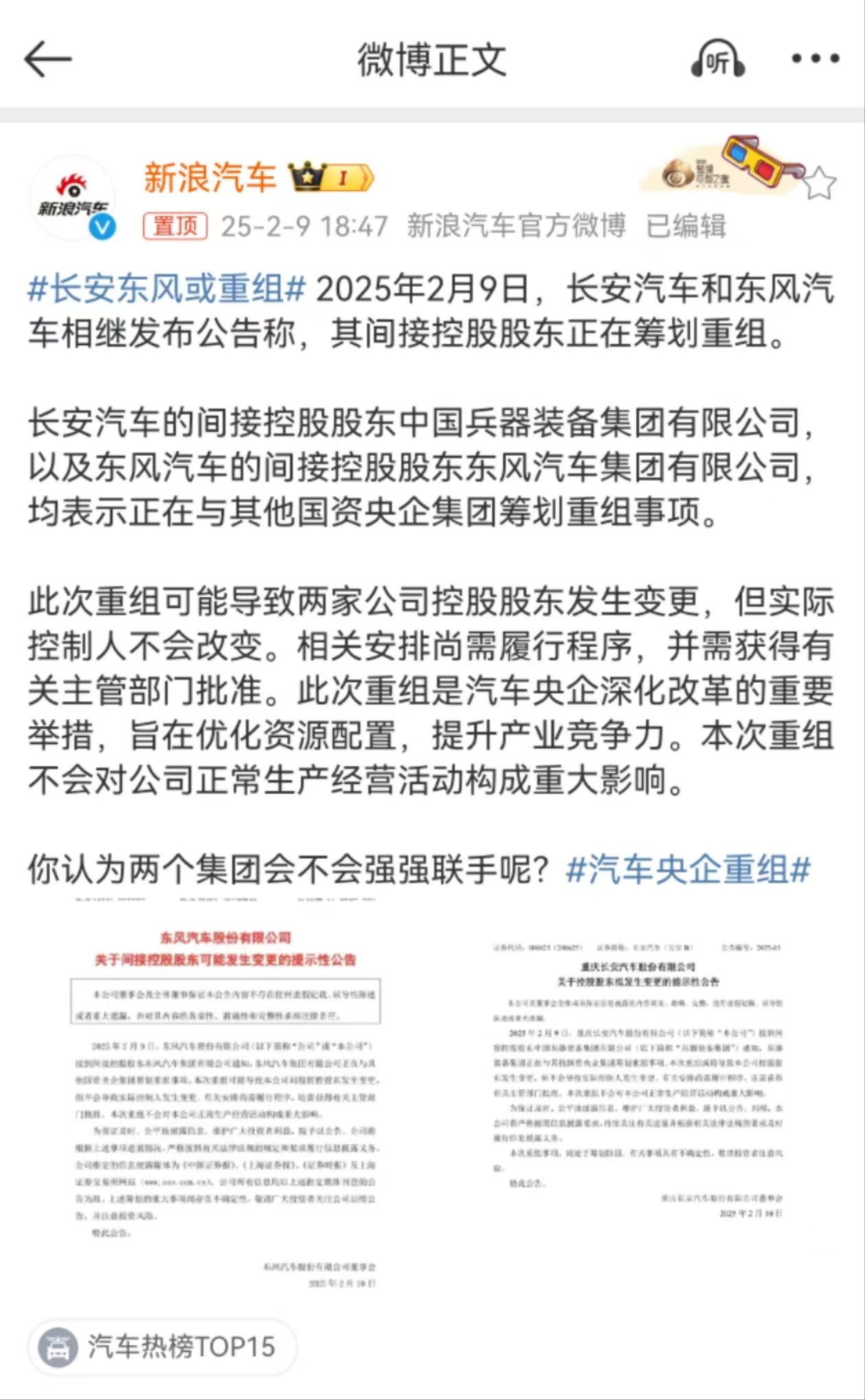 2月9日,星期日,一个看似波澜不惊周末,没成想爆发出来了东风长安重组合并的热搜话题!