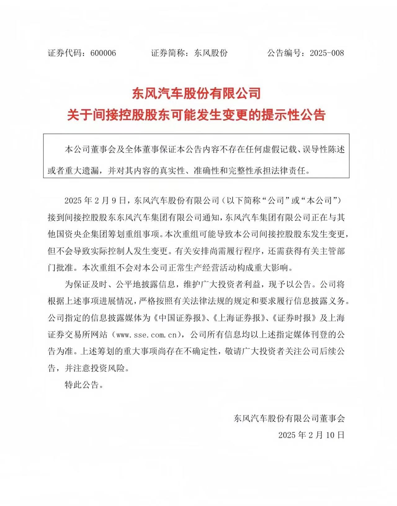据东风汽车股份有限公司(600006.SH)公告称,公司接到间接控股股东东风汽车集团有限公司通知,东风汽车集团有限公司正在与其他国资央企集团筹划重组事项。本次重组可能导致公司间接控股股东发生变更,但不会导致实际控制人发生变更。有关安排尚需履行程序,还需获得有关主管部门批准。同时还声明,本次重组不会对公司正常生产经营活动构成重大影响。