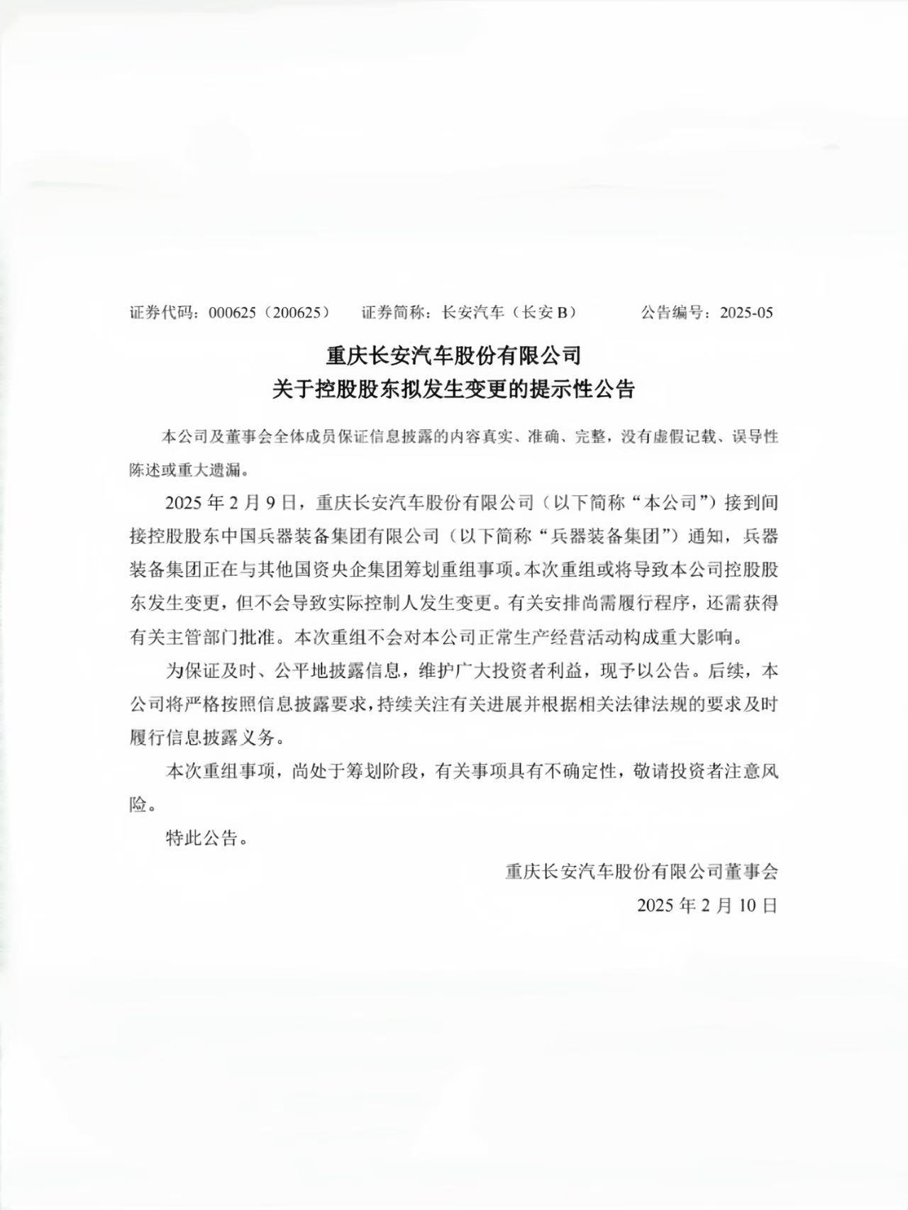 几乎同时,重庆长安汽车股份有限公司(下称“长安汽车”,000625.SZ)也发出公告称,接到间接控股股东中国兵器装备集团有限公司(下称“兵器装备集团”)通知,兵器装备集团正在与其他国资央企集团筹划重组事项。