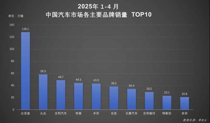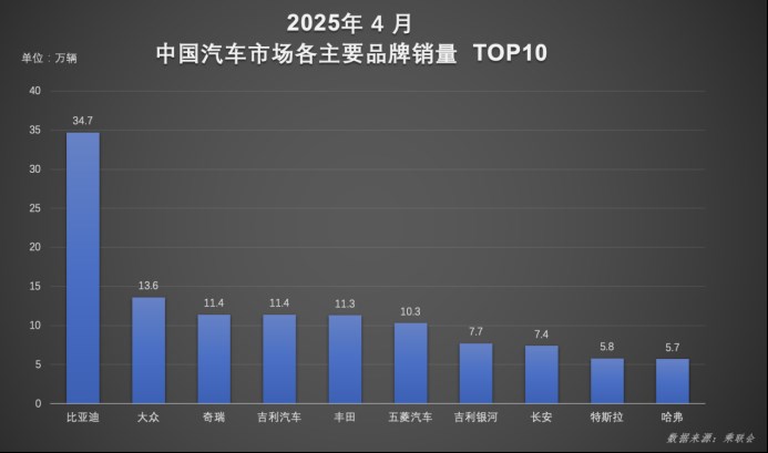 4月,比亚迪汽车宛如一颗璀璨的明星,在中国汽车市场中熠熠生辉。单月销量达到34.7万辆,一举夺得各主要品牌销量TOP10的冠军宝座,销量近乎是第二至四名之和,展现出强大的市场统治力。1 - 4月累计销量更是突破128.1万辆,同比增长幅度显著,增长势头如汹涌浪潮,持续领跑新能源汽车市场,成为行业发展的风向标。