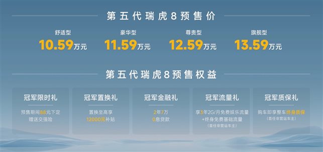 11月3日,作为奇瑞“中国新燃油”战略的重点车型,第五代瑞虎8开启预售,预售价格10.59万-13.59万元,推出虎款与豹款两个款型各四个型号,聚焦家庭用户核心需求。虽然是燃油动力,但在先进技术的运用、智能化、配置上都向电车靠拢。