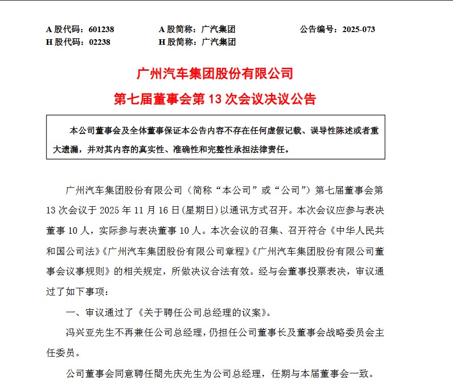 11月16日,广汽集团发布一则人事公告:经市场化遴选与组织考察,集团正式聘任閤先庆为总经理,王丹为总会计师,高锐、江秀云、郑衡、黄永强、陈家才为副总经理。业内普遍认为,这一涵盖 “本土帅才+外部强援” 的复合型团队组建,既是广汽“番禺行动”迈向人才实战的重要落子,更标志着这家处于深度调整期的老牌车企,进入战略突围的关键一役。