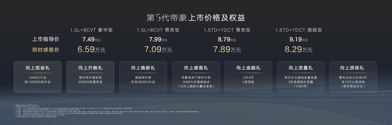 除产品力外,第五代帝豪在价格与权益上也极具诚意,6.59万元起的限时售价与指导价相比直降万元,1000 元订金抵1万元的政策更是大幅降低购车门槛。此外,老用户专属补贴与换购补贴也展现出对存量用户的诚意。