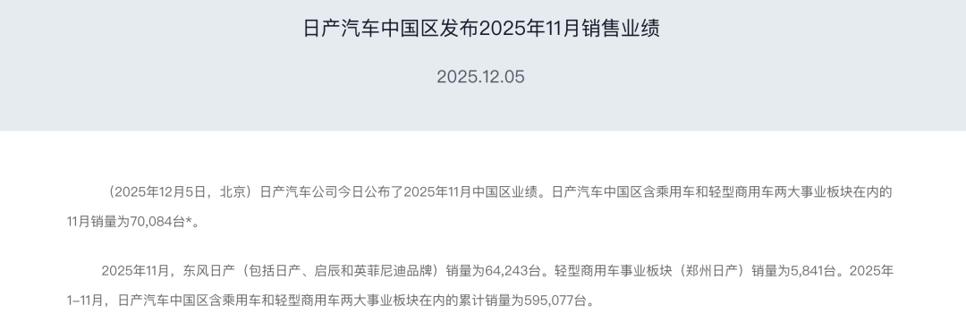 【东风日产】(包括日产、启辰和英菲尼迪品牌)11月销量为64243台,同比、环比双增长。其中,日产品牌销量为62300台,同比增长13.2%。轩逸11月交付超3.8万台,创下2025年月度销量新高。此外,轻型商用车事业板块(郑州日产)11月销量为5841台。