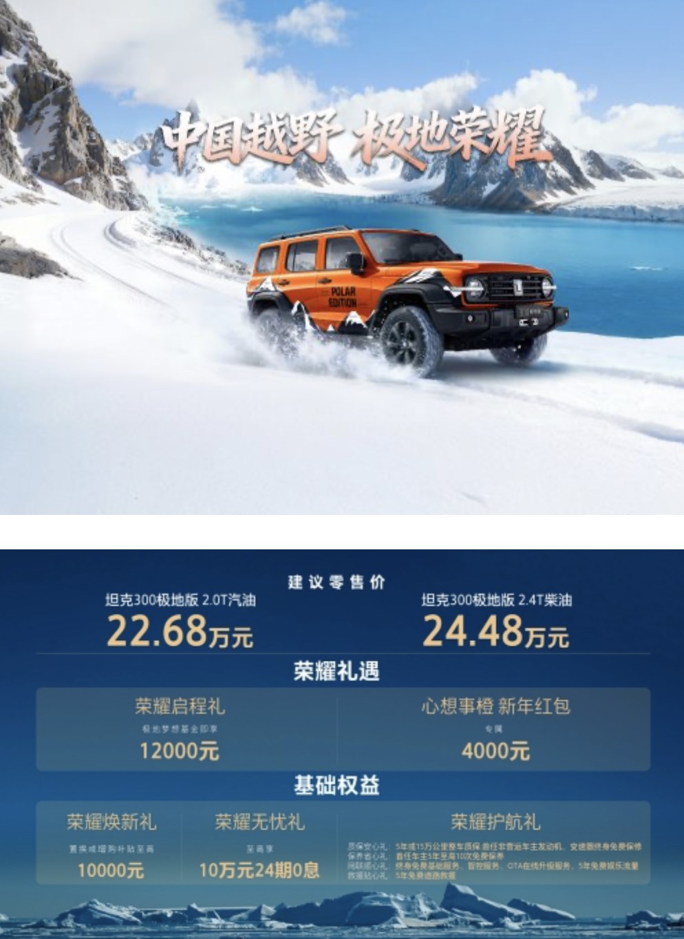 近日,买车网Buycar获悉,坦克300极地版正式上市,2.0T汽油版本售价22.68万元,2.4T柴油版24.48万元,并推出荣耀启程礼、心想事橙新年红包和多项基础权益等多重购车礼遇。