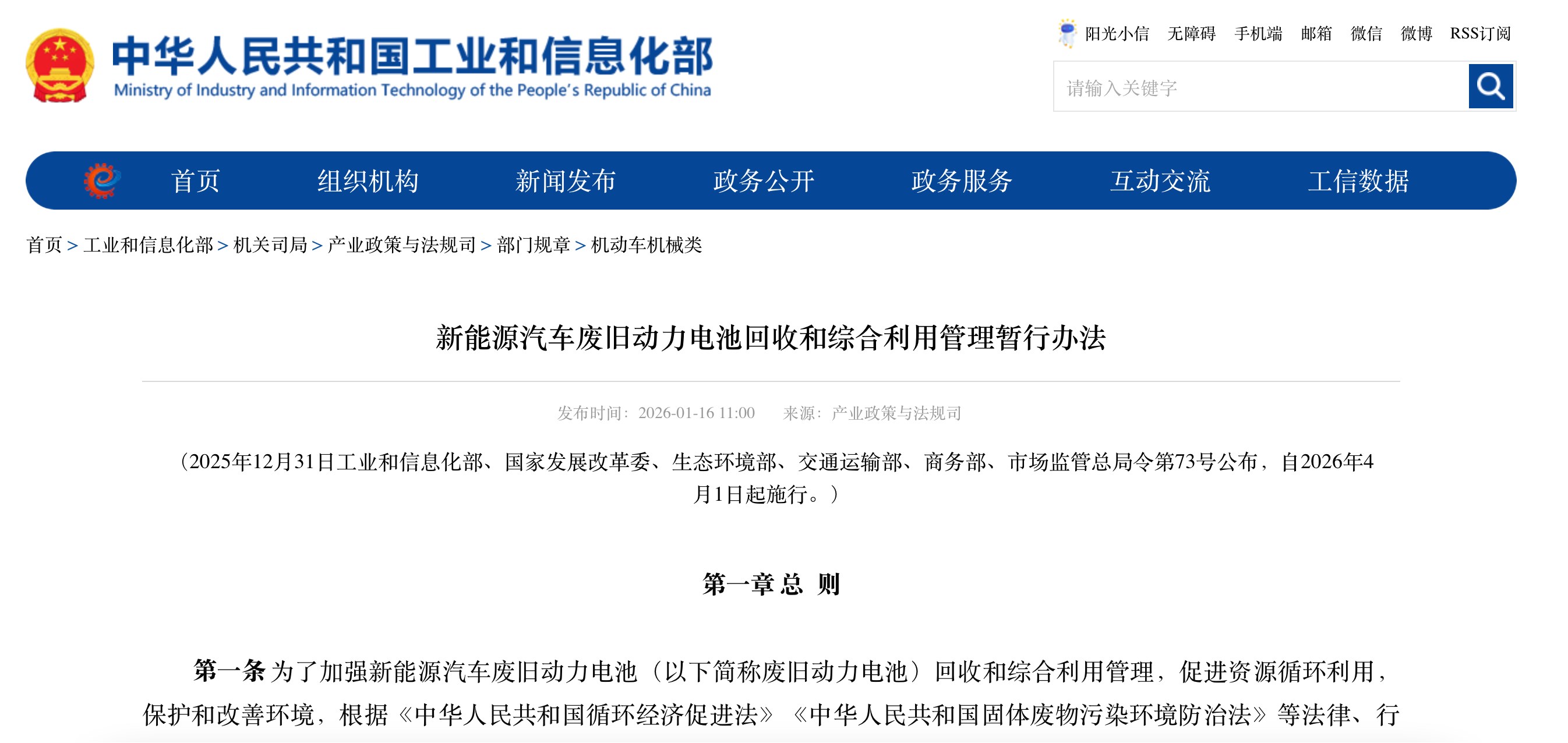 绿色低碳是汽车产业高质量发展的必由之路,而废旧动力电池回收利用则是新能源汽车产业闭环发展的关键环节。2026开年六部门联合公布《新能源汽车废旧动力电池回收和综合利用管理暂行办法》,进一步规范废旧动力电池回收利用秩序,推动产业绿色可持续发展。