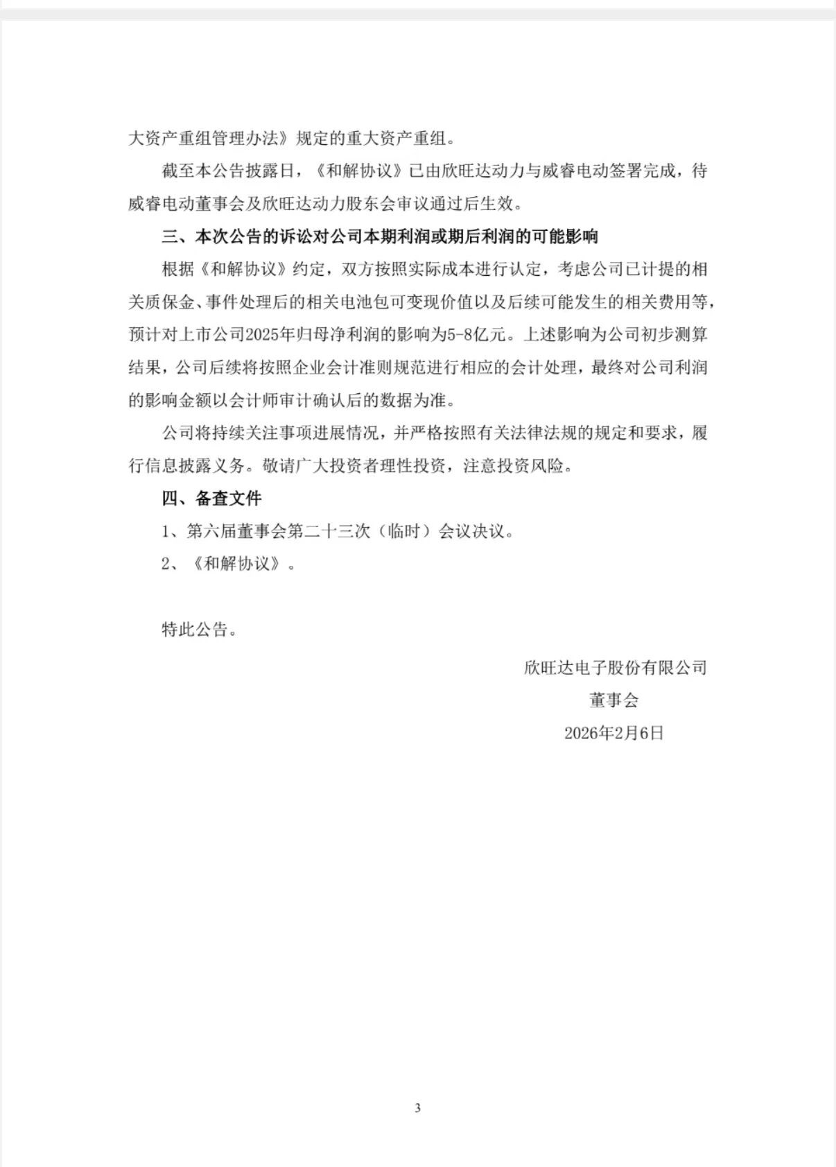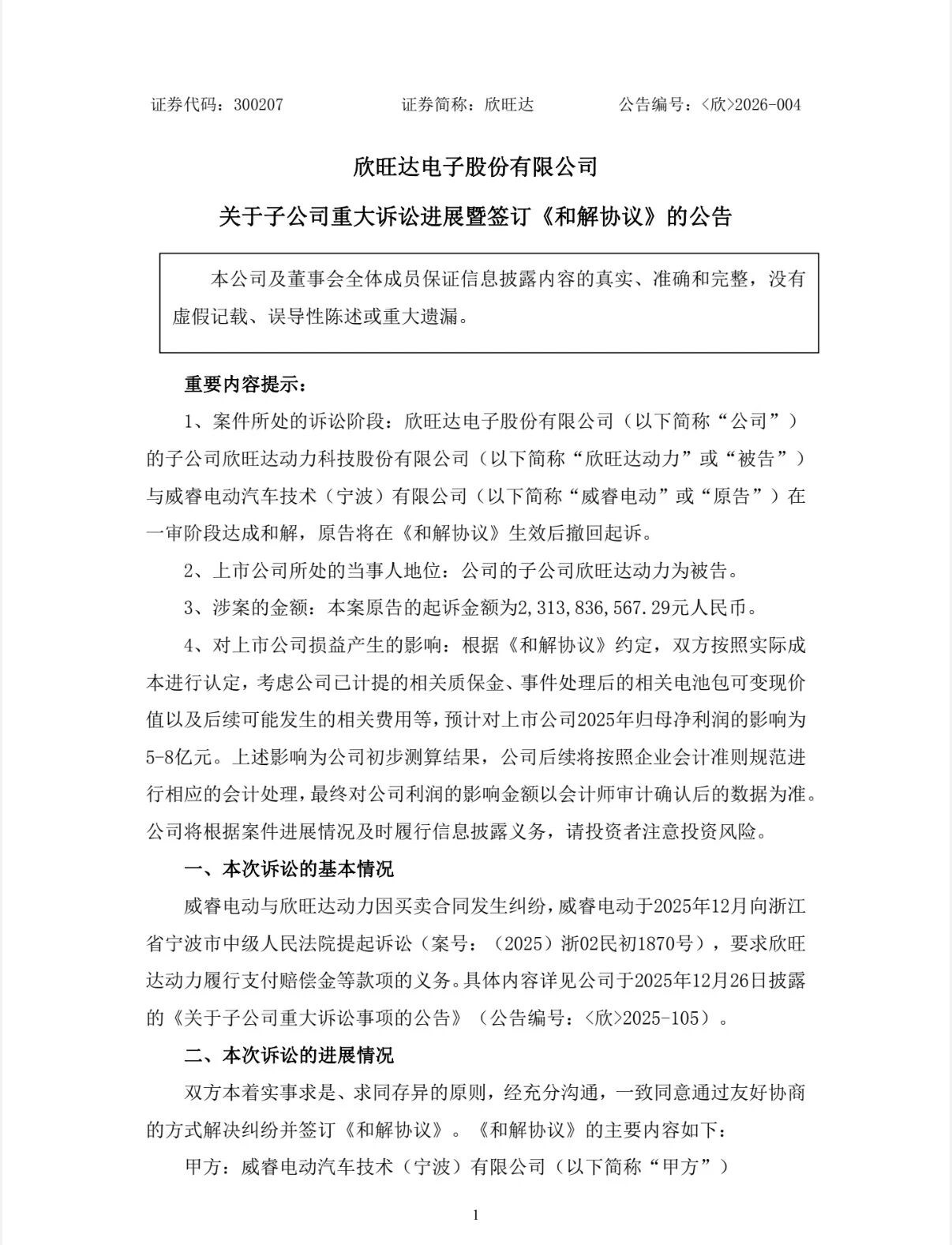 2026年2月6日,欣旺达(300207.SZ)发布公告,其子公司欣旺达动力科技股份有限公司与威睿电动汽车技术(宁波)有限公司在一审阶段达成和解,威睿电动将在《和解协议》生效后撤回此前金额超23亿元的起诉。