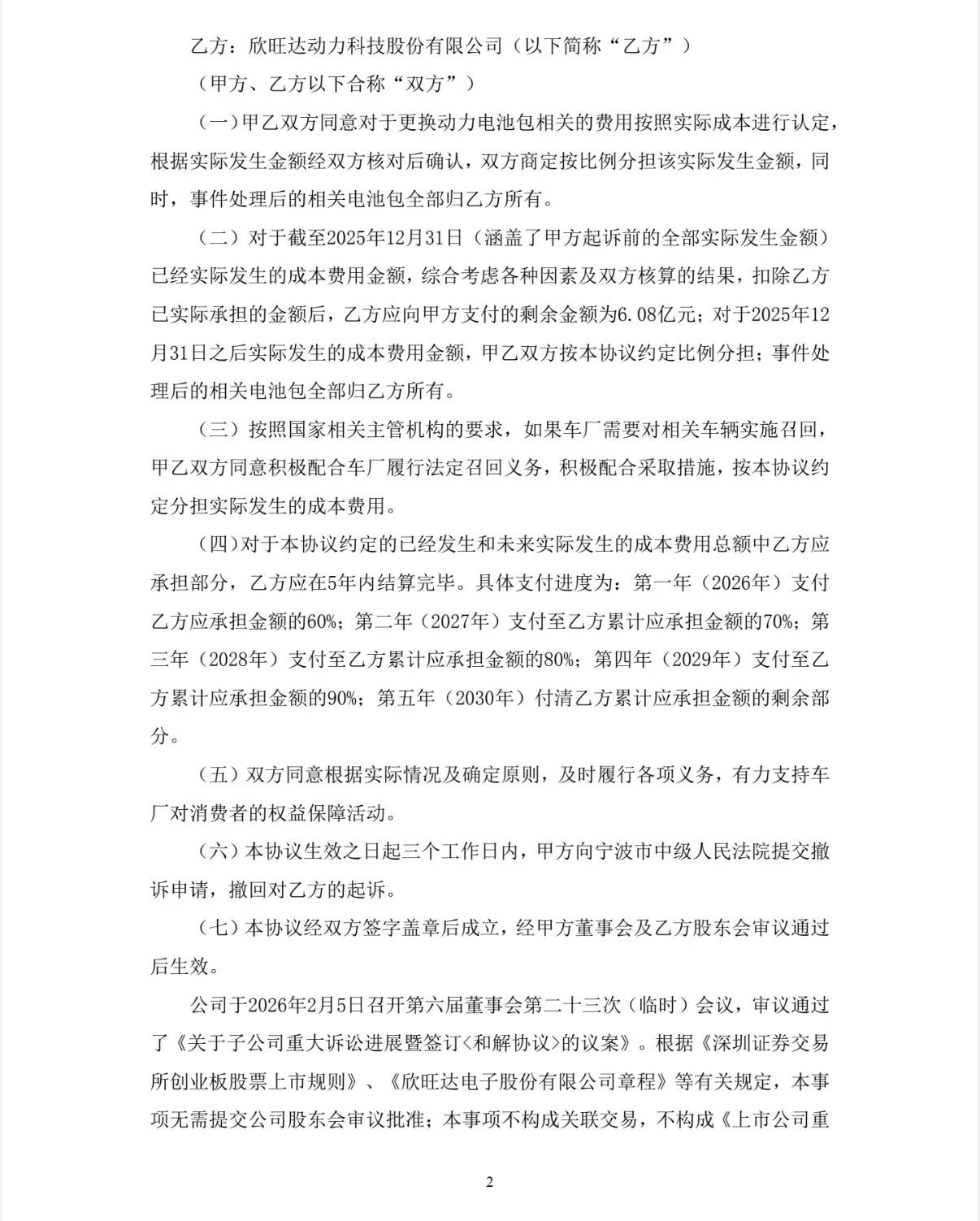 具体来看,对于截至2025年12月31日(涵盖了威睿电动起诉前的全部实际发生金额)已经实际发生的成本费用金额,综合考虑各种因素及双方核算的结果,扣除欣旺达动力已实际承担的金额后,欣旺达动力应向威睿电动支付的剩余金额为6.08亿元;对于2025年12月31日之后实际发生的成本费用金额,双方按本协议约定比例分担;事件处理后的相关电池包全部归欣旺达动力所有。