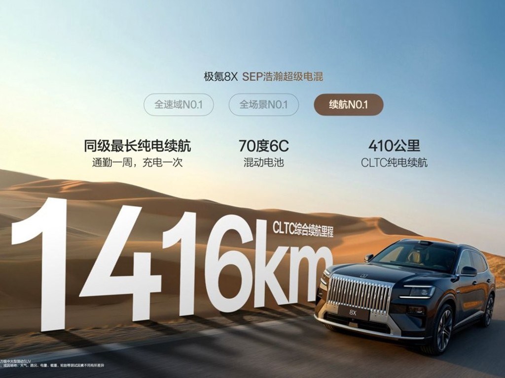 极氪8X不仅是快,还兼顾了实用。搭载70kWh 6C混动电池的车型,CLTC纯电续航达到410公里,综合续航1416公里,配合900V高压架构下20%-80%充电仅需9分钟的效率,真正做到了“跑得快、用得省、补能急” 。