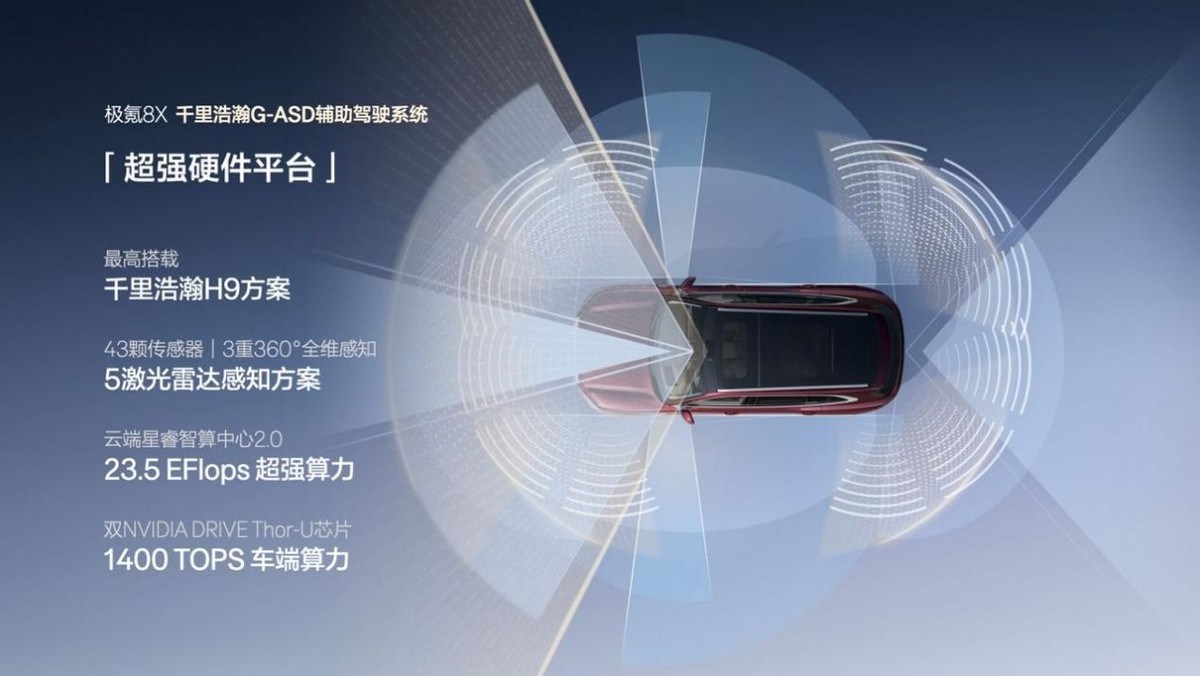 作为首发搭载新一代G-ASD高阶辅助驾驶系统的车型,极氪8X在智驾硬件上毫不吝啬。顶配车型配备5激光雷达、双NVIDIA DRIVE Thor-U芯片(算力1400TOPS),配合43颗传感器,构建了极其冗余的感知系统 。虽然实际体验还需后续验证,但在硬件预埋上,极氪8X已经为未来的L3级甚至更高级别自动驾驶留足了空间。