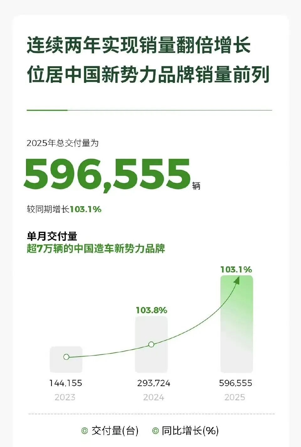 最直观的亮点在于“规模效应”的兑现。59.66万辆的年销量,103.1%的同比增幅,让零跑一举超越对手,登顶新势力销冠。