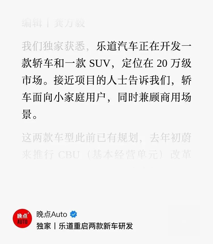 写在最后:总言之,只要乐道轿车能继续保持端庄设计、依托换电优势,并将租电起售价锚定在18万以内,那它完全有实力和可能成为纯电轿车市场里的“奥迪A6”。当然了,目前曝光的还是博主所绘制的渲染图,乐道轿车的实车到底会不会出现,又是否真的长这样,一切还得等待官方进一步的消息。可以预见到的是,只要乐道真能出轿车,那应该还是会有不错市场销量前景的,对它感兴趣的朋友也不妨持续保持关注与期待。(文/优视汽车 大卓 )
