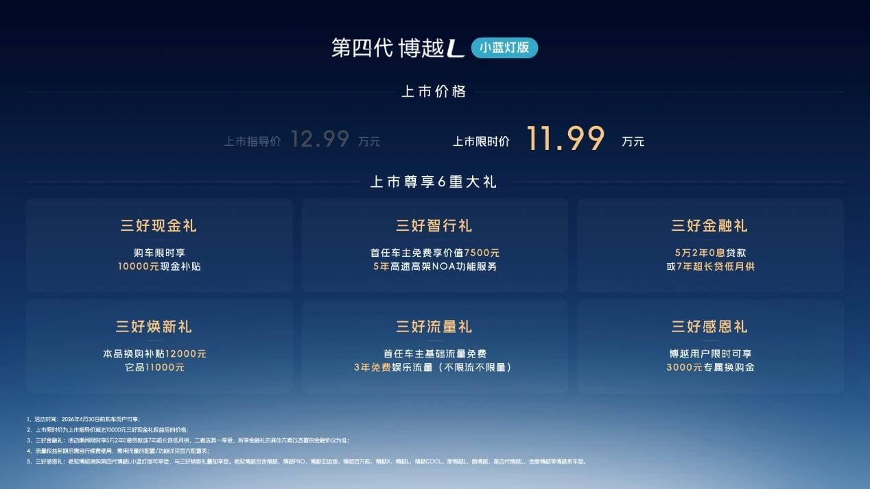 即日起至4月30日,用户购买第四代博越L小蓝灯版可限时享换购补贴12000元,博越用户换购还可叠加3000元专属换购金,此外还有7年超长贷等金融礼、流量礼、智行礼共计6重上市大礼。