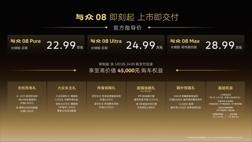 与众08全系共享800V平台、宁德时代电池、高阶智驾与大五座空间,安全与智能底线很高。结合限时至高4.5万元权益,大家根据自身预算与用车场景选择即可,不必盲目上顶配。