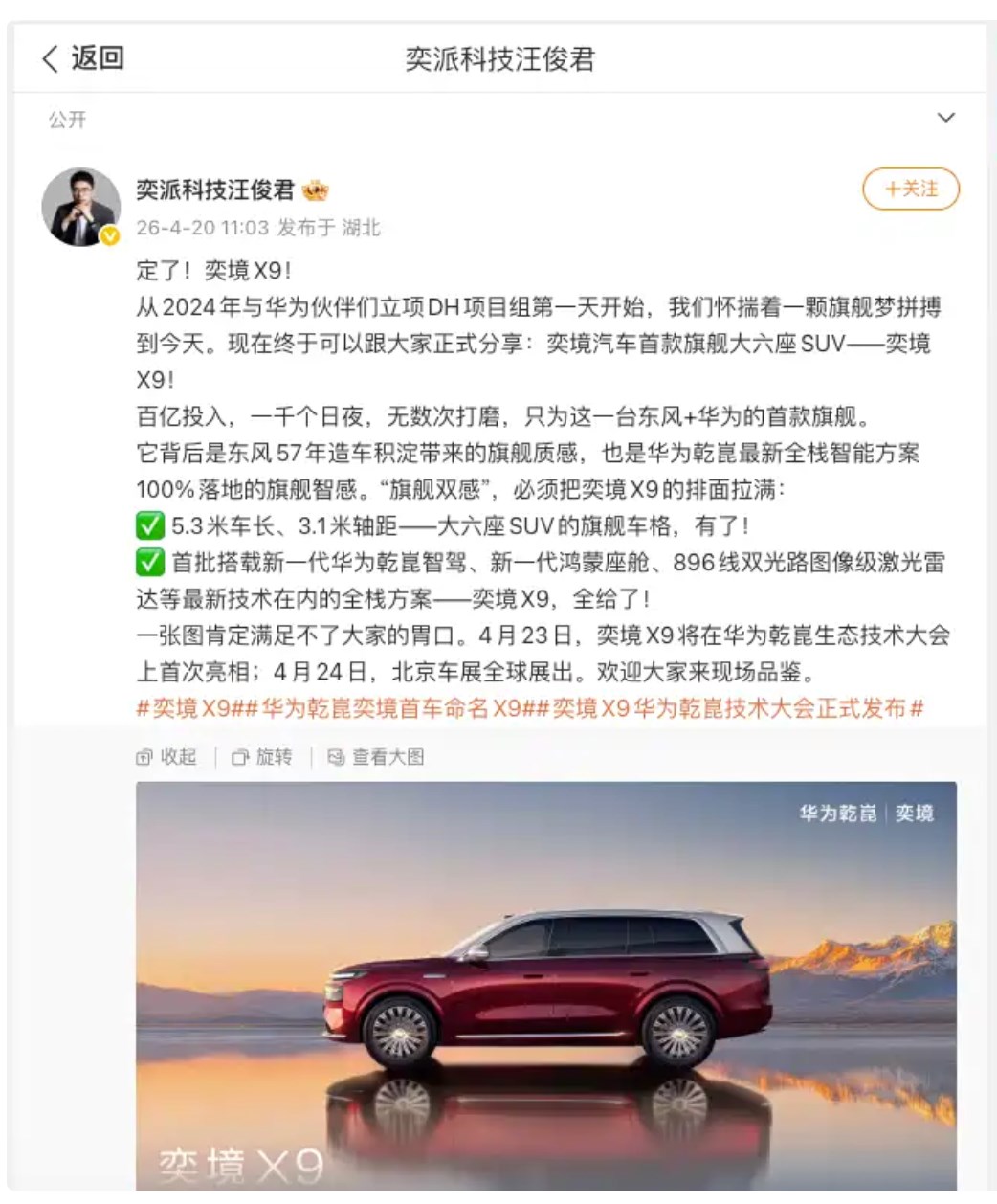 4月20日,买车网Buycar获悉,东风奕派汽车科技公司总经理@奕派科技汪俊君在社交媒体上发布了奕境品牌旗下首款车型部分官图,并表示该车正式定名为奕境X9。同时,该车将在4月23日开幕的华为乾崑生态技术大会上首发亮相,并在4月24日开幕的2026北京车展对公众亮相。